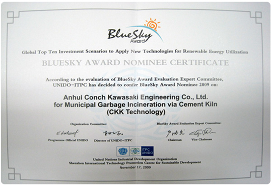 2009年11月17日,該技術獲得聯合國 2009年度全球可再生能源領域最具投資價值的領先技術“藍天獎”提名獎。